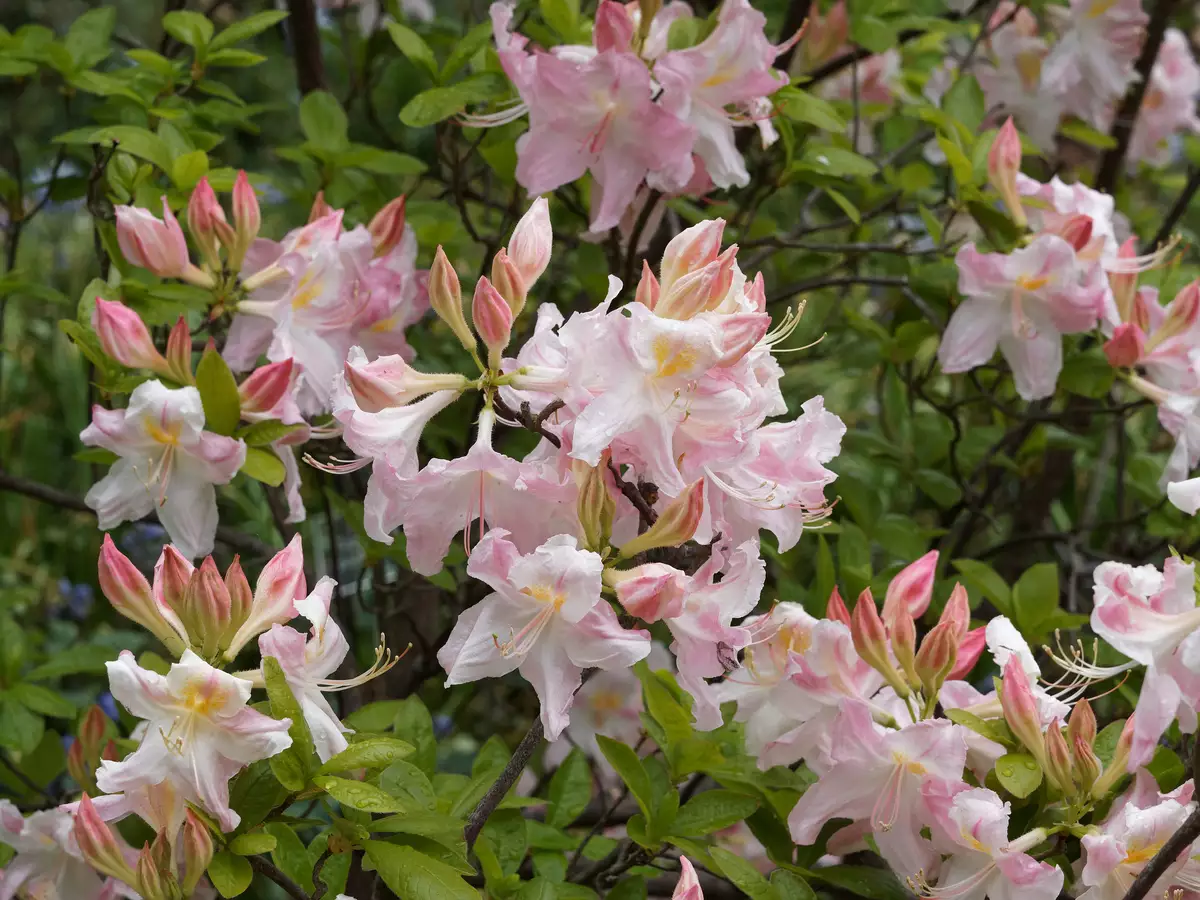 Discover the captivating allure of Western Azalea (Rhododendron occidentale), a stunning native shrub found amid the diverse flora of the West Coast. Revered for its enchanting beauty and fragrant blooms, this deciduous marvel graces gardens and natural landscapes from Oregon's foggy coastlines to California's serene mountain meadows. Standing between 6 to 16 feet tall, with a similar spread, this compact yet striking shrub delights with clusters of trumpet-shaped flowers in shades of white to pale pink, often adorned with golden to orange spots. The vibrant blooms, which emerge in spring before the foliage, emit a sweet, clove-like fragrance that fills the air, enchanting all who wander near.