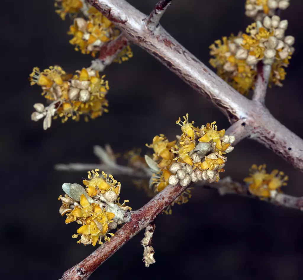 Blooms of tiny, tubular yellow flowers in March herald the onset of a vibrant spring, making way for clusters of striking, pea-sized red fruits by fall. These fruits, though sour, become sweeter after frost and are cherished by diverse wildlife for their rich nutritional content. Historically, Native American tribes revered the buffaloberry for its culinary versatility, often complemented as a tart addition in jams and berry compotes or even transformed into a sweet frothy foam—a delicacy at traditional gatherings.