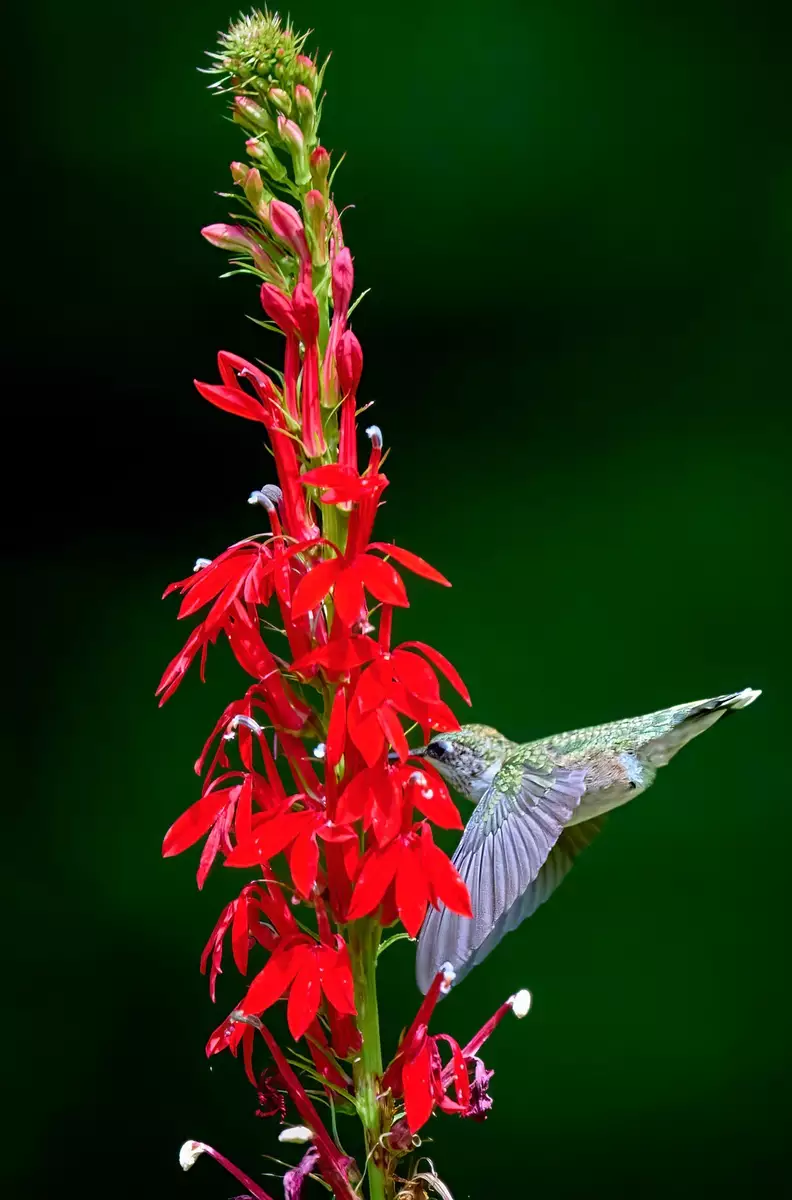 Lobelia cardinalis, commonly known as Cardinal Flower, is a striking herbaceous perennial native to the Americas. This captivating plant, treasured for its vibrant scarlet red blooms. Ideal for USDA hardiness zones 3 to 9, it graces gardens with its towering presence, reaching heights of 2 to 4 feet with a spread of 1 to 2 feet. Cardinal Flower thrives in moist, rich soils and can tolerate full sun in cooler northern climates or appreciates part shade in warmer zones. Its blooming period extends from July to September, transforming landscapes with its showy, two-lipped tubular flowers that prove irresistible to hummingbirds and butterflies. Perfect for naturalizing and enriching rain gardens, it withstands deer, rabbits, and even wet soils. Although it is a short-lived perennial, the plant's prolific self-seeding nature ensures its perpetual grace in the garden. Known for its easy maintenance, Cardinal Flower can adapt to various settings, like moist woodland areas or water gardens, adding a vivid splash of color and life to your outdoor space.