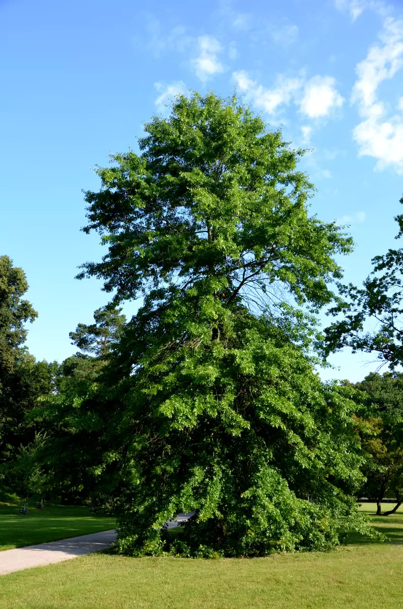 Pin Oak (Quercus palustris) offers excellent shade and is great for streets, parks, and yards. Its distinctive shape sets it apart from other hardwoods, making it a popular choice amongst landscape designers. In addition to its beauty, Pin Oak also provides food and shelter for a variety of wildlife such as birds, squirrels, deer, and raccoons. Its wood is used for furniture, veneers, and flooring, and its acorns are a source of food for wildlife. When planting Pin Oak, it is important to choose an acidic, well-drained location with full sun exposure. The tree grows quickly and reaches maturity at around 20-30 years old. With proper care and maintenance, pin oak can thrive for up to 120 years. Overall, Pin Oak is a versatile and attractive addition to any landscape, offering beauty and function to both people and wildlife alike.