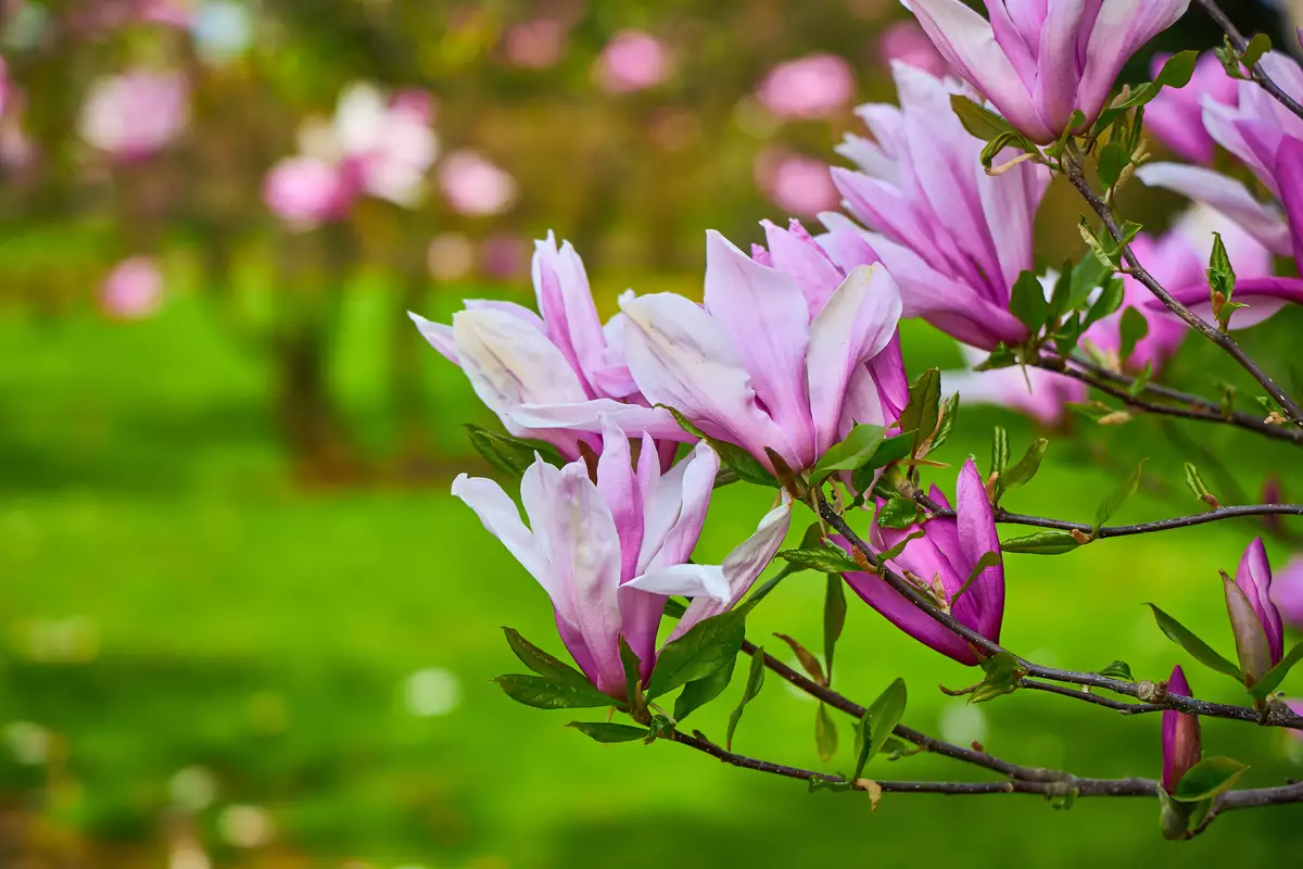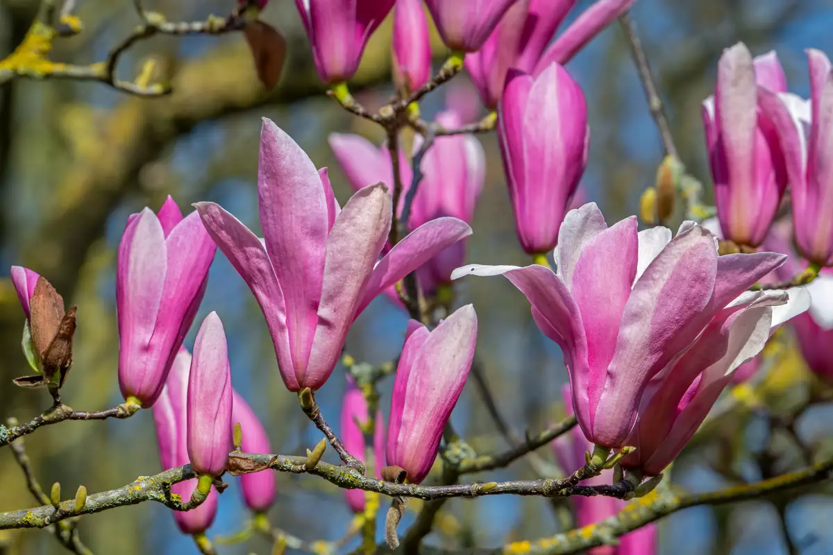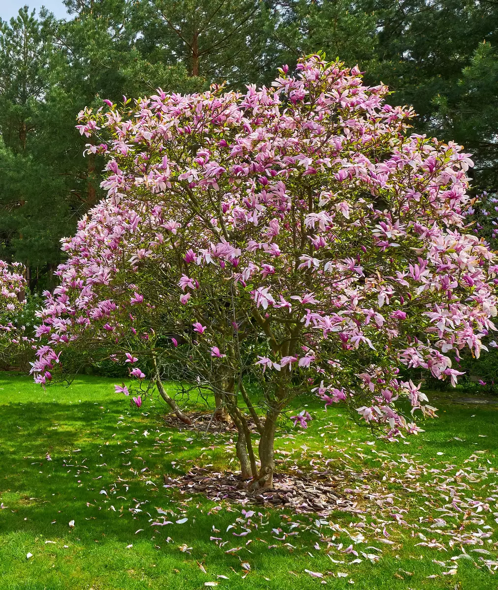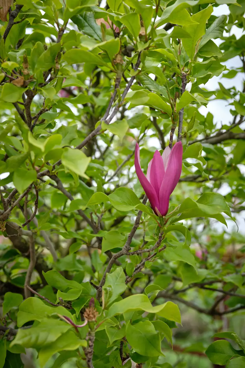 Discover the enchanting beauty of Magnolia liliiflora, commonly known as Lily Magnolia, a slow-growing ornamental shrub or small tree that's perfect for adding charm to your landscape. This compact, multi-stemmed deciduous plant reaches heights of 8 to 12 feet and spreads just as wide. Native to South-Central and Southeastern China, it thrives in well-drained, organically rich soils, appreciating full sun to partial shade. Its goblet-shaped, purplish-red flowers, with delicate white interiors, bloom in spring, often appearing before the lush, dark green foliage unfurls. This bloom may even repeat itself sporadically in mid-summer, offering extended visual delight. Ideal for USDA Zones 5-8, this species prefers locations sheltered from strong winds and thrives with consistent moisture. Due to its unique, shrubby form and stunning floral display, Lily Magnolia excels as a specimen plant, screen, or informal hedge.