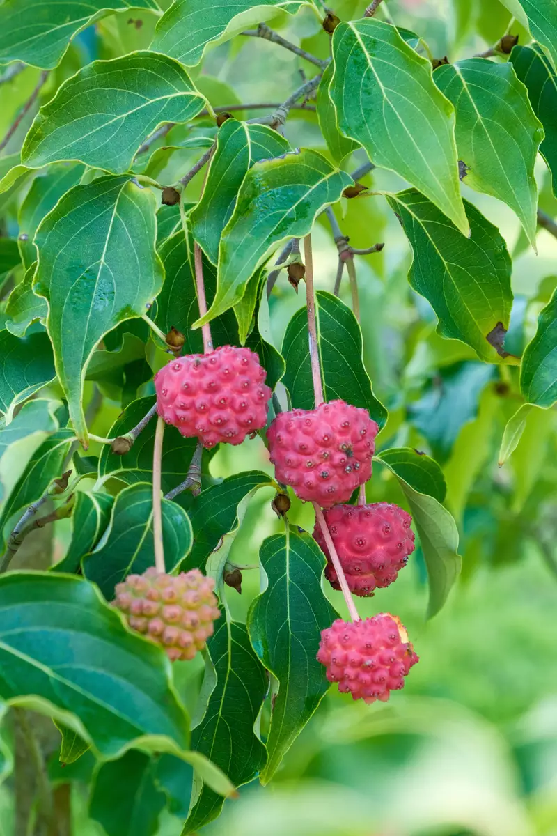 With dark green, pointed leaves turning vibrant orange-red to scarlet in autumn, Milky Way Kousa Dogwood provides a captivating foliage display throughout the seasons. Its highly ornamental red berries, maturing in summer, are not only showy but also edible, while drawing birds and butterflies to your garden. Adapted to thrive in hummusy, well-drained soils, it performs exceptionally well in full sun to part shade and is remarkably low maintenance with excellent resistance to common diseases.
