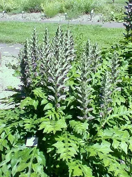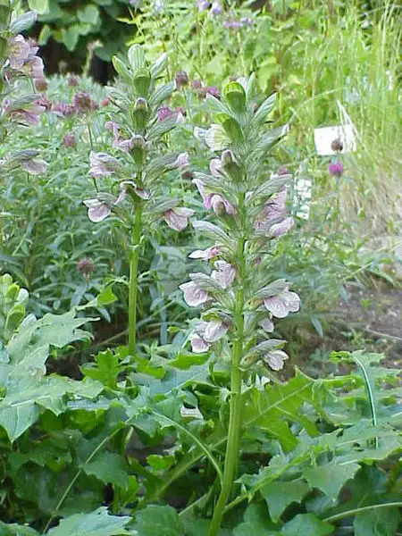 * An erect, clump-forming perennial which features pale pink to white flowers enclosed in spiny, reddish-purple bracts and arranged in vertical rows on substantial flower spikes rising well above the foliage to 3-4' tall.