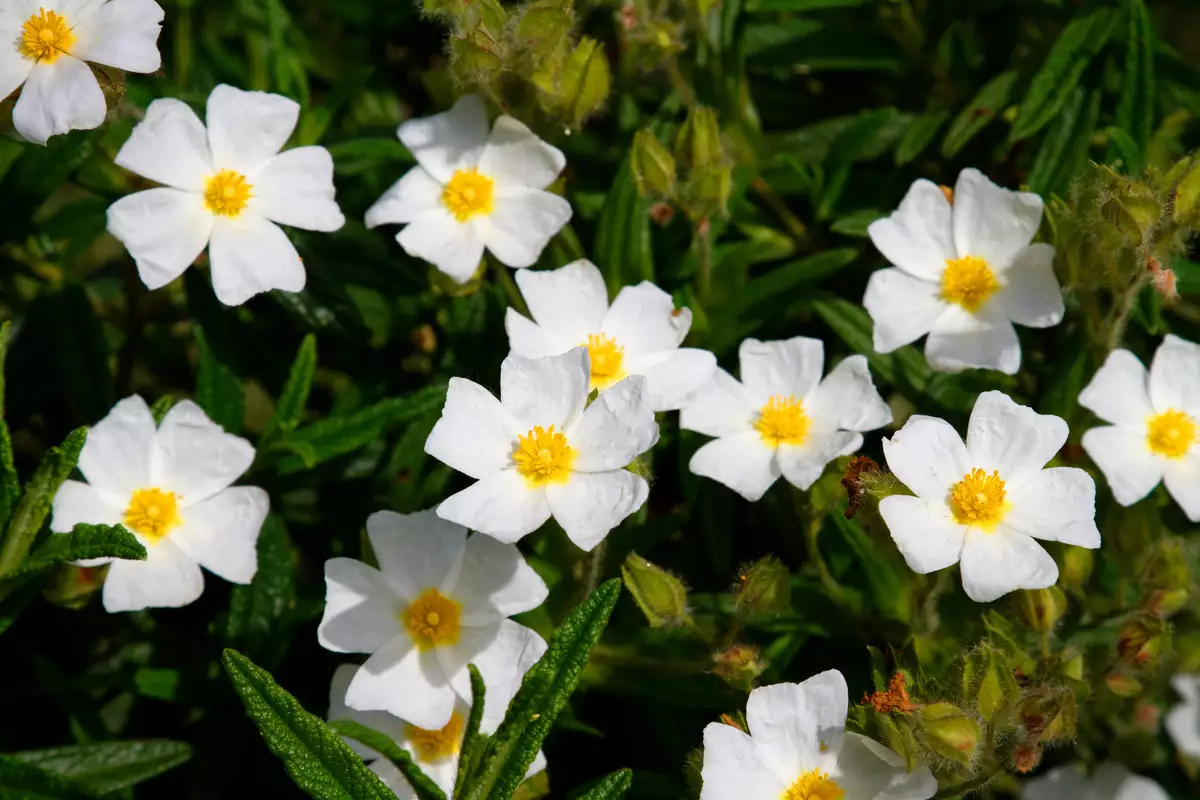 Discover the captivating allure of Cistus monspeliensis, commonly known as Montpelier Rockrose, an ornamental evergreen shrub ideal for enhancing hedges, groups, and slopes. Native to the Mediterranean’s rugged garigue landscapes, this resilient shrub thrives in sun-drenched, well-drained environments, characteristic of temperate and Mediterranean climates. Reaching up to 3-4 ft in height, it flaunts a tapestry of sticky, dark green leaves and striking pure white flowers adorned with vibrant yellow stamens. Its aromatic foliage not only adds enchantment to gardens but also serves culinary and medicinal purposes—it's even used to impart a unique taste to smoked cheese.