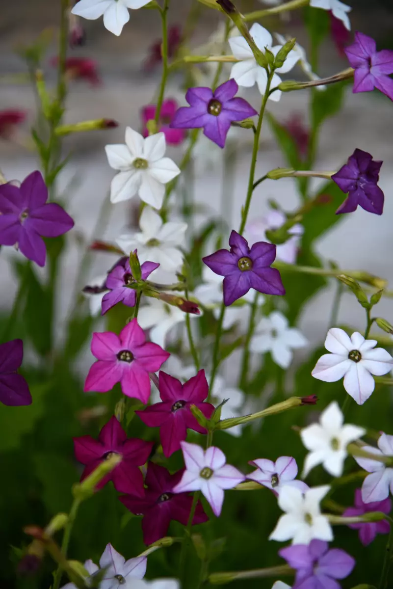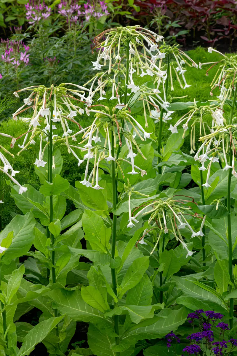 Experience the enchanting allure of Nicotiana alata, commonly known as Jasmine Tobacco or Tobacco Flower, a standout in any garden setting. This graceful plant captivates with its tall, elegant stems reaching 3 to 5 feet, adorned with broad leaves and luminous starry flowers that nod gently in the breeze. At dusk, as warm evenings draw near, its sweet jasmine-like perfume fills the air, attracting exotic nighttime pollinators and delighting gardeners with its nostalgic aroma. Thriving in full sun to partial shade, Jasmine Tobacco flourishes in moist, well-drained soil enhanced with organic matter. Despite its tropical appearance, it's adaptable to various climates, handling heat, humidity, and cooler conditions with ease. While summer nights illuminate its blossoms, these South American natives bring a touch of magic to borders, patios, and rock gardens with their intoxicating fragrance. This annual flower (perennial in Zone 10) ensures a unique sensory experience from July through October, inviting nature and tranquility to your outdoor space.