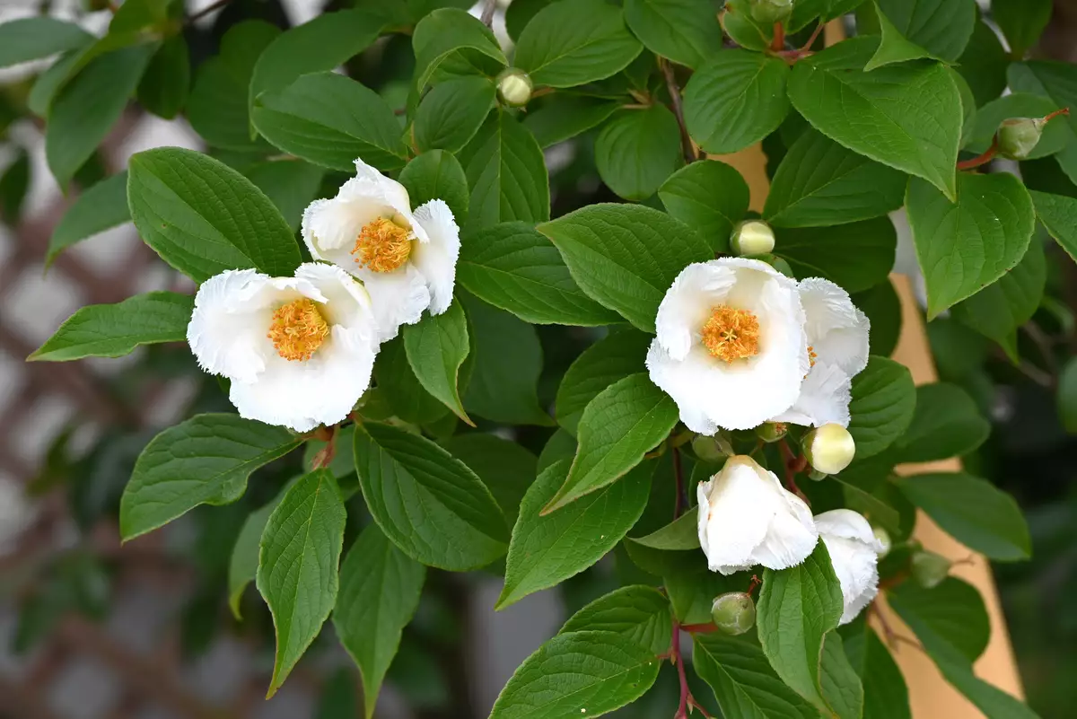 From June to July, Japanese Stewartia adorns itself with showy, cup-shaped white flowers accentuated by vibrant orange-yellow anthers, reminiscent of its Camellia relatives. As autumn arrives, its foliage transforms into a stunning display of reddish-orange and burgundy hues. Throughout winter, its exfoliating bark, revealing shades of gray, orange, and reddish-brown, adds visual intrigue even when foliage is absent.