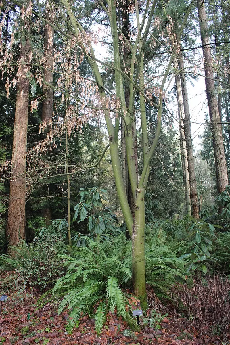 Discover the rare and enchanting Acer pectinatum ssp. forrestii, commonly known as Forrest's Maple or Snakebark Maple. This exceptional small tree captivates with its striking beauty and seasonal transformations. In winter, its younger stems boast a vibrant, deep red bark adorned with distinctive white stripes, echoing the allure of the best Redtwig Dogwoods. As temperatures drop, the foliage turns a vivid butter yellow, creating a stunning contrast against the increasingly red bark. The trunk and older branches mellow into an ashen olive hue, embellished with fine white stripes, adding elegance and intrigue to any landscape.