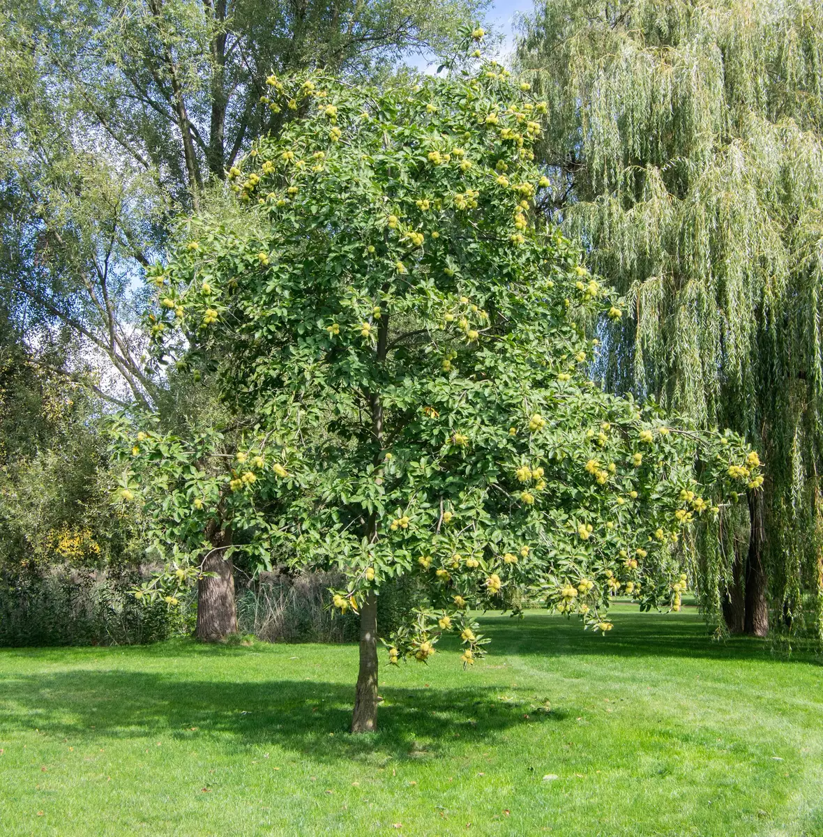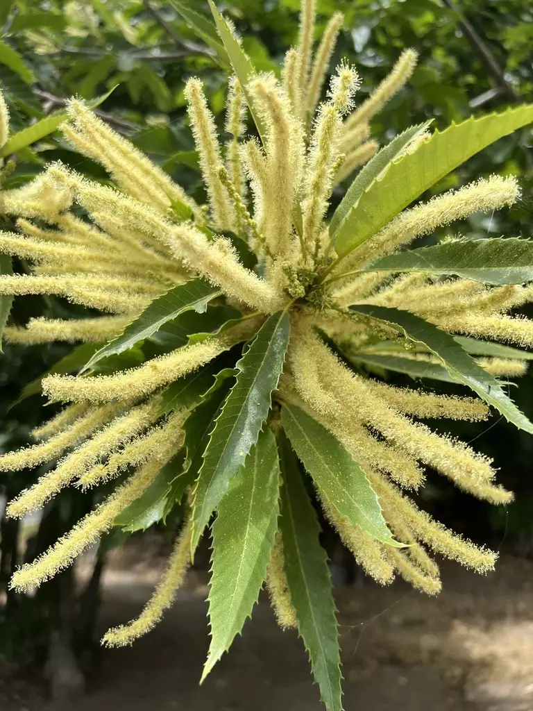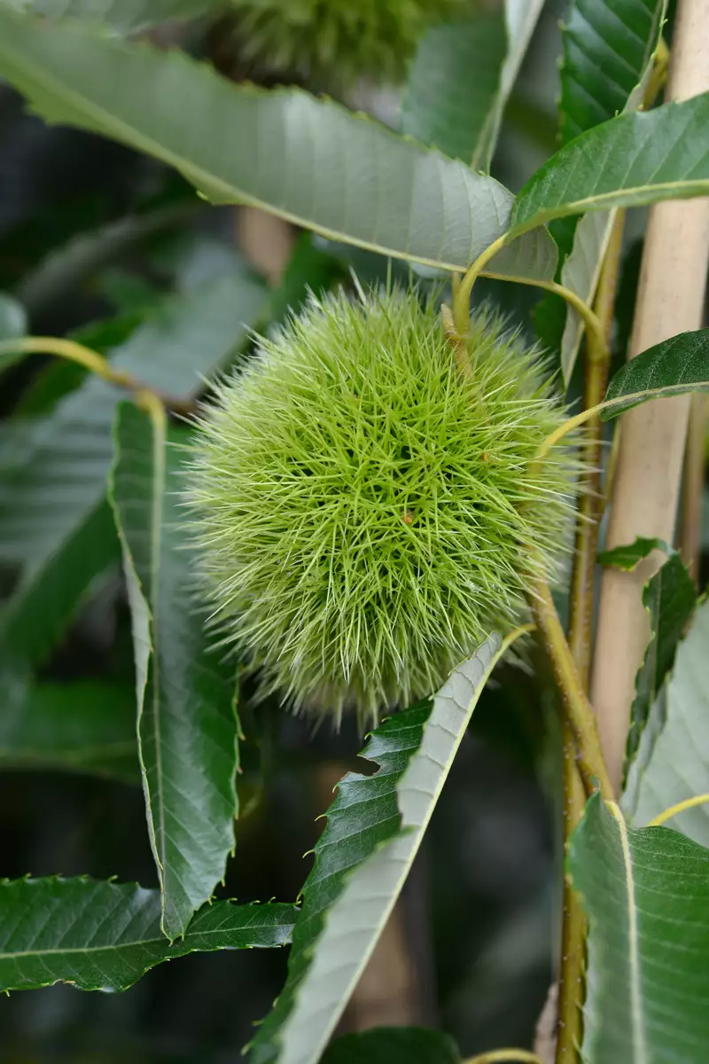 Precoce Migoule Chestnut is a remarkable hybrid between European chestnut (Castanea sativa) and Japanese chestnut (Castanea crenata). This tree, named for its origin in the orchard of Migoule in Brive-la-Gaillarde, is celebrated for its vigorous, erect growth, achieving a height of up to 60 ft with a spread of 25-35 ft. Ideal for temperate climates, Precoce Migoule thrives in areas where grapes are also cultivated, showcasing impressive cold hardiness down to -20°F and performing well up to altitudes of 1640 ft on south-west facing slopes.