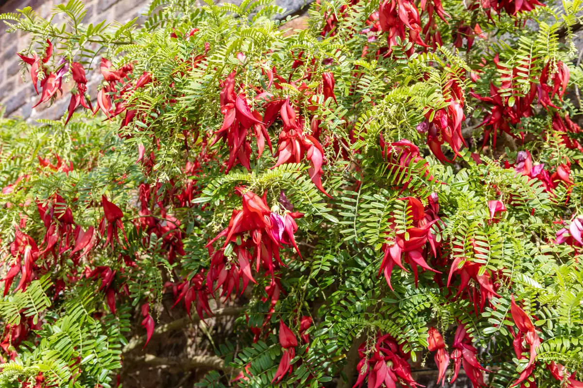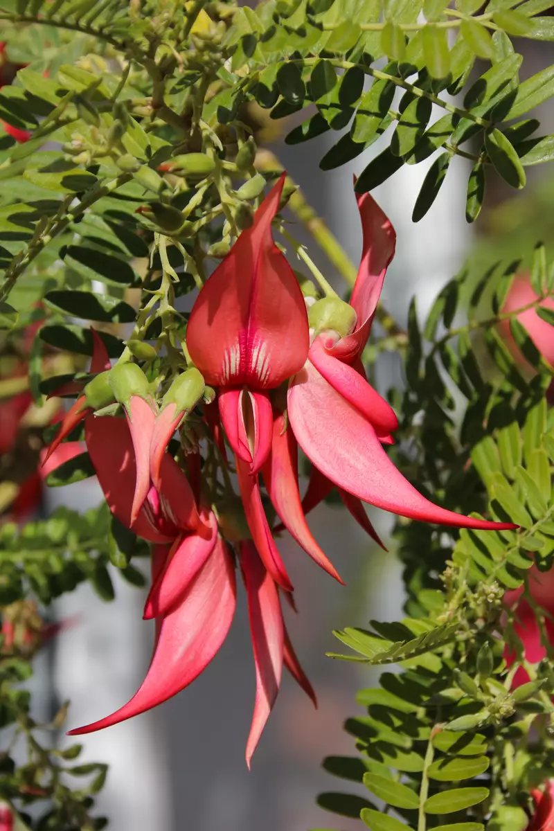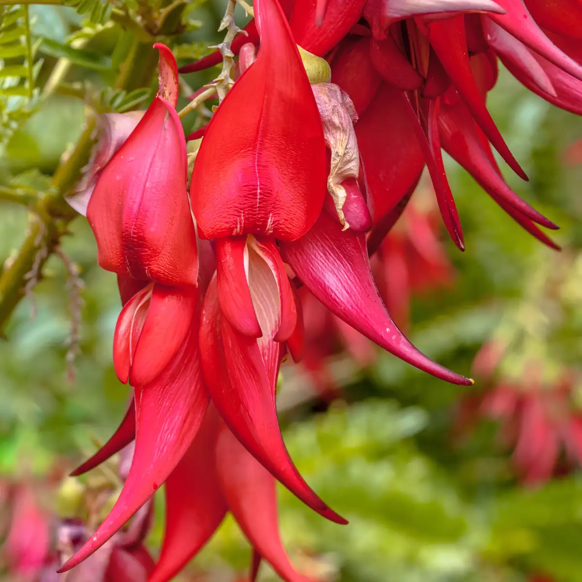 Discover the captivating beauty of Clianthus puniceus 'Rosea', commonly known as Pink Kaka Beak or Pink Parrot Beak. This extraordinary evergreen shrub from New Zealand is a perennial delight, offering a stunning display of exotic, rose-red to pink blooms. The distinctive 3-inch, parrot-beak-shaped flowers hang in pendulous clusters, embellishing gardens from spring to early summer. Growing between 4 to 6 feet tall and wide, this lush plant thrives in rich, well-drained soil and prefers full sun to partial shade, though it appreciates protection from late afternoon heat. Hardy to 20°F, it's perfect for zones where frost and strong winds are minimal. Pink Kaka Beak features striking dark green, pinnate foliage and versatile climbing stems, reaching up to 12 ft when supported. Although it's rare in the wild (considered endangered), this beautiful shrub can be trained into a tree form or espaliered, making it an eye-catching centerpiece for patios and gardens. Regular watering and post-bloom pruning enhance its flourishing growth and mesmerizing appearance.