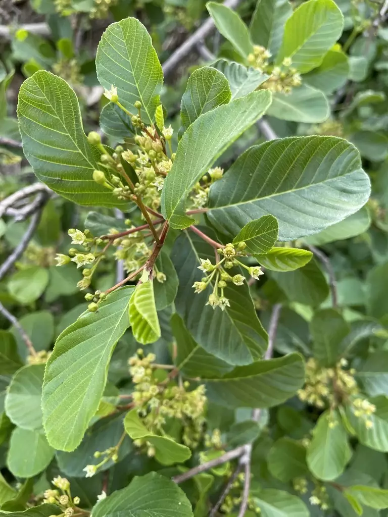 Discover the unique allure of Frangula purshiana, commonly known as Cascara or Cascara Buckthorn. A native gem of the Pacific Northwest, Cascara is a versatile deciduous tree or shrub cherished for its aesthetic charm and historical significance. Growing up to 50 feet tall, it features soft, velvety twigs and naked buds with rusty pubescence. Its leaves, resembling dogwood, are elliptic and glossy green, transitioning to striking shades of yellow, orange, red, and purple in fall, depending on sun exposure. In spring, yellow-green umbrella-shaped flower clusters grace the branches, followed by purplish-black berries that entice birds and wildlife.