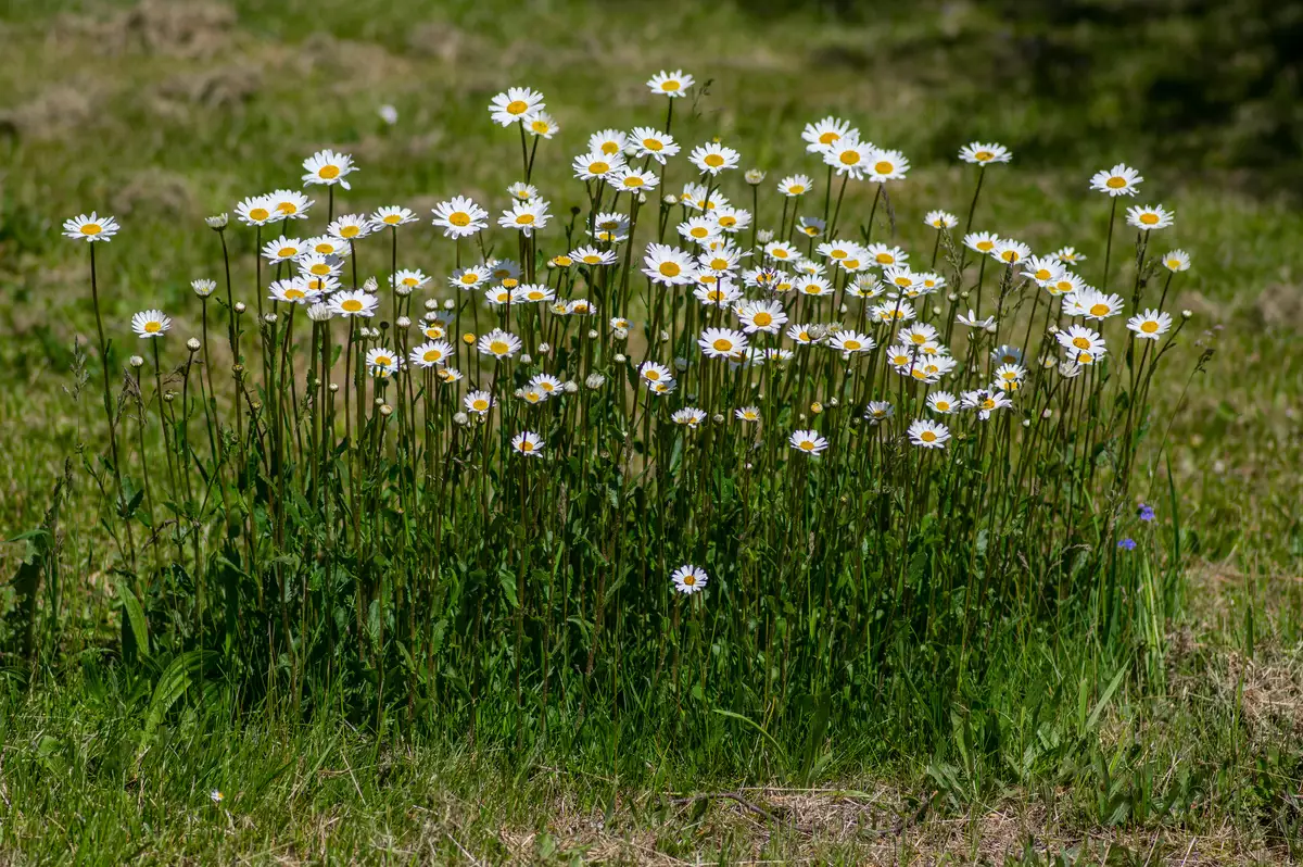 Discover the captivating beauty of Leucanthemum vulgare, commonly known as Ox-eye Daisy, Dog Daisy, or Marguerite. This enchanting perennial, introduced from Europe both as an ornamental and through inadvertent seed contamination, can elevate your garden with its classic charm. Standing 10 inches to 2 feet tall, Ox-eye Daisy showcases spoon-shaped basal leaves and toothed, narrow upper leaves, with stunning blooms from June to August. Each flower, 1 to 3 inches in diameter, has 15 to 30 pristine white ray petals, creating a solitary yet striking display. Known for its resilience, this plant thrives in well-drained soil, preferring full sun but gracefully tolerating afternoon shade in warmer climates. Its adaptability allows it to flourish across diverse habitats such as mountain meadows, grasslands, or garden beds. Add an Ox-eye Daisy to your perennial borders, cottage gardens, or wildflower settings to create a lively landscape. To maintain its vigor, divide your plants every 2-3 years and deadhead spent blooms for continuous flowering. While its beauty is irresistible, bear in mind its potential to invade, making careful management necessary. Explore the elegance of Ox-eye Daisy and transform your outdoor space into a picturesque oasis.
