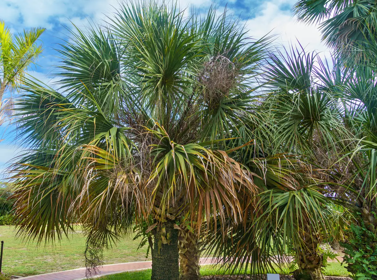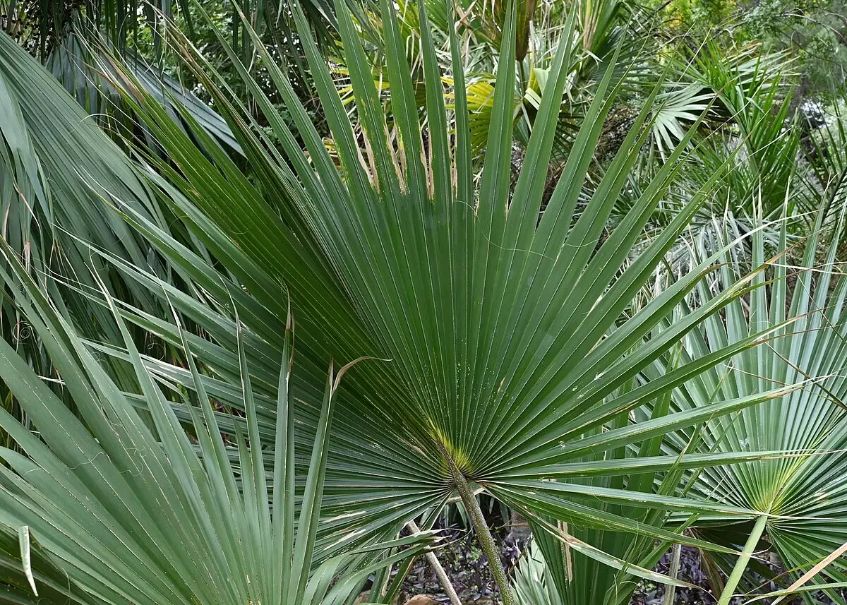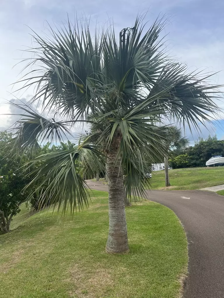 Discover the unique Sabal bermudana, the only palm species endemic to Bermuda. Also known as Bermuda Palmetto, this remarkable tree thrives in various environments, from coastal forests to freshwater marshes. Known for its resilience, this evergreen palm is astonishingly salt and frost-tolerant, enduring temperatures as low as 6°F, though such cold is rare in Bermuda. Reaching heights up to 80 ft, with some rare specimens growing to 100 ft, it sports a robust trunk up to 1.8 ft in diameter. Its lush, fan-shaped leaves, each up to 6 ft long, create a striking presence. The tree's yellowish-white flowers, arranged in elegant, long panicles, yield dark brown to black drupes, each containing a single seed.
