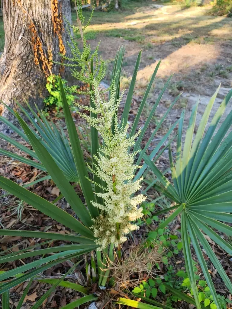 Dwarf Palmetto is known for its fan-like, deeply-divided palmate leaves that add a lush, exotic touch to any garden. It blooms in the summer, displaying fragrant yellowish-white flowers that attract pollinators, followed by shiny black drupes that are a favorite of birds and small mammals. This plant flourishes in partial shade to full sun, preferring moist to wet, neutral to alkaline soils, and is tolerant of poor drainage, some drought, and moderate salt levels.