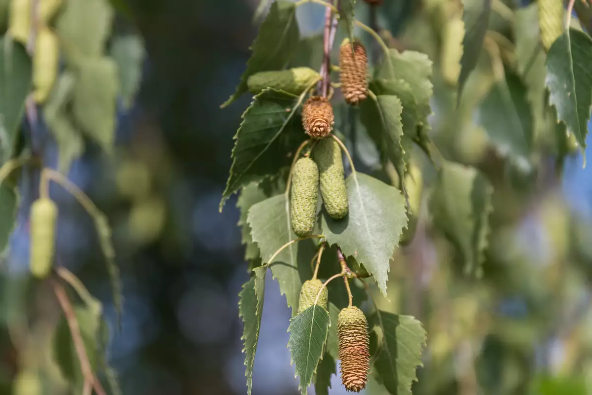 Gray Birch blooms in spring, showcasing tiny monoecious flowers in separate catkins—yellow-brown for the males and green for the females. As summer progresses, the female flowers transform into drooping cone-like fruits filled with small winged seeds, providing a valuable food source for songbirds during winter. This tree is versatile in its tolerance for a range of soil types, including poor, sandy, or rocky loams, and it can thrive in both full sun and part shade environments. Although high in maintenance, the gray birch's beauty can be a focal point in naturalized settings and rain gardens.