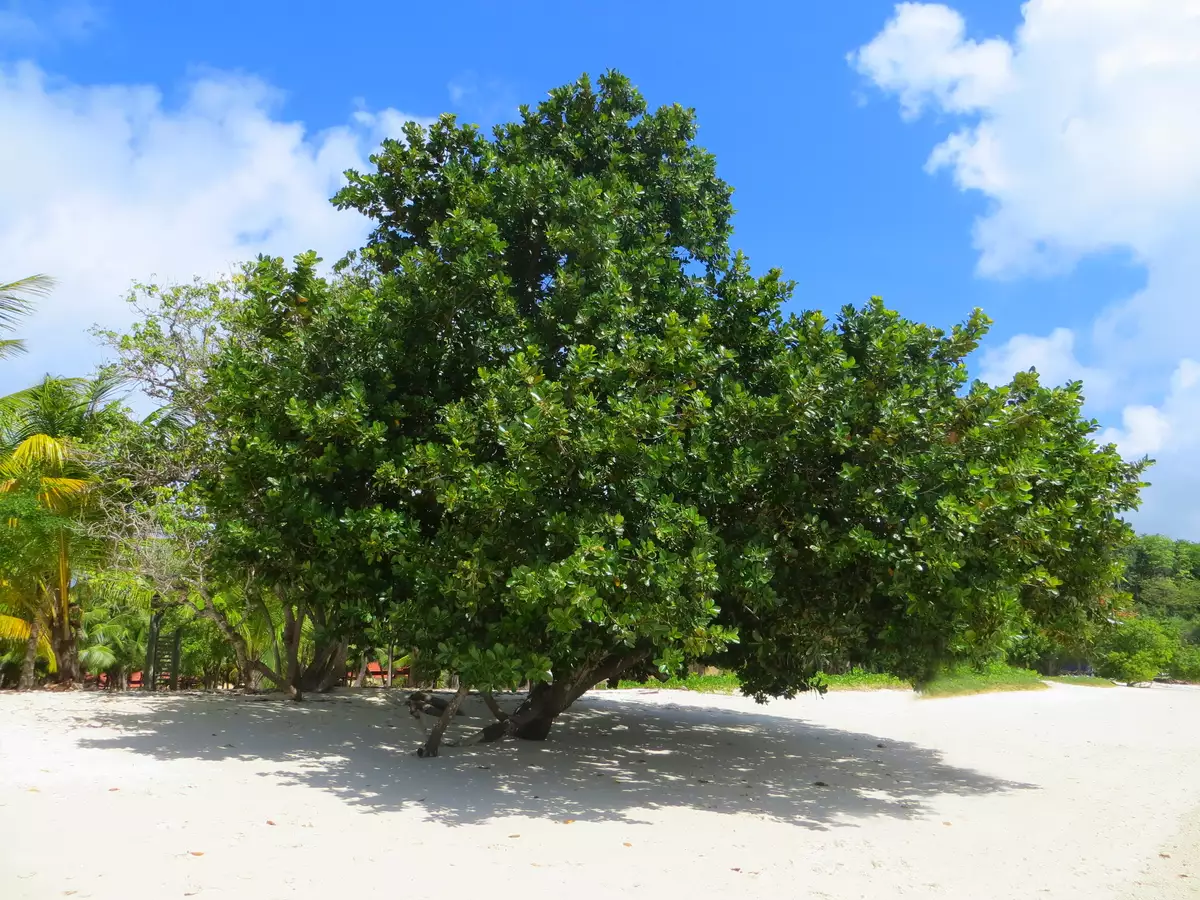 Calophyllum inophyllum, also known as Alexandrian Laurel or Beauty Leaf, is a striking evergreen tree native to the Old World Tropics, widespread from Africa through Asia to Australia and Polynesia. Revered for its ornamental and utilitarian attributes, it boasts a dense, pyramidal crown reaching up to 60 feet in lush tropical landscapes. This slow-growing species is ideal for urban settings as a shade or specimen tree, thriving amid air pollution, compacted soil, and drought. Recognizable by its smooth, leathery dark green leaves and fragrant white flowers that bloom in generous racemes each summer, the tree provides a year-round touch of elegance. The fruit is a round, hard drupe containing a potentially toxic single seed. Its robust, light grey bark and durable wood have historically been crucial in traditional shipbuilding, offering resilience and beauty. Known under various local names, this tree contributes to ecosystems as a buffer along coastlines, adapting well to sandy soils, and serving as a windbreak. Cultivation often extends beyond its native regions, including urban landscapes across the Pacific, further celebrated for its salt and wind tolerance. Note: The seeds are a source of the culturally significant tamanu oil, though caution is advised due to their toxic properties.