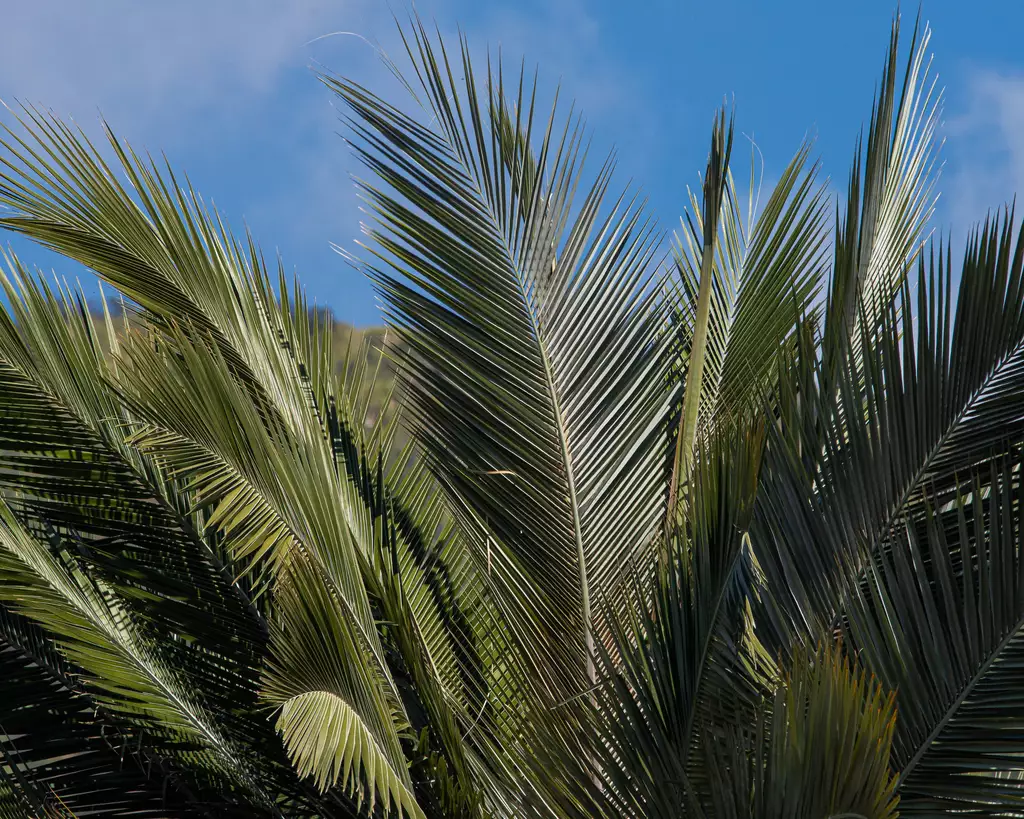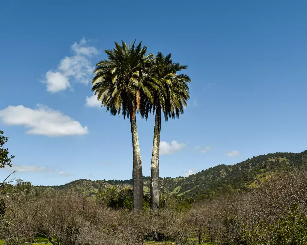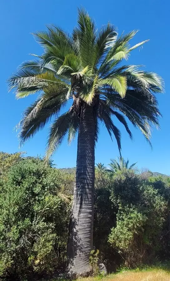 Discover the majestic allure of the Jubaea chilensis, commonly known as Chilean Wine Palm or Coquito Palm, a true marvel of the botanical world. Revered as the largest and most cold-hardy pinnate palm, this extraordinary species can attain an impressive height of up to sixty feet and a trunk diameter of up to six feet, though three to four feet is more typical. Its resilience to cold is unmatched, thriving in climates as varied as USDA zone 8 and cooler. With the ability to withstand severe frost down to 3°F, it thrives in temperate and subtropical regions. Despite its imposing size, Chilean Wine Palm is slow-growing, spending years developing its wide base before ascending skyward.
