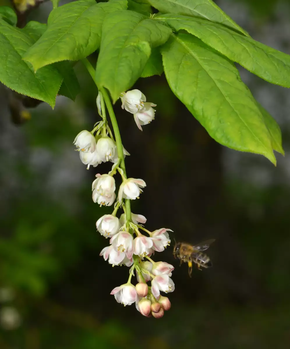 Adorned with nodding, white, bell-shaped flowers accented with pink overtones, European Bladdernut blooms from May to June. Its dark green foliage emerges as a vibrant lime green in spring, transitioning to a breathtaking lemon yellow in fall. The shrub's ornamental appeal is further enhanced by bladder-like, light green seed capsules in early fall, and its smooth, grayish-green bark adds winter interest.
